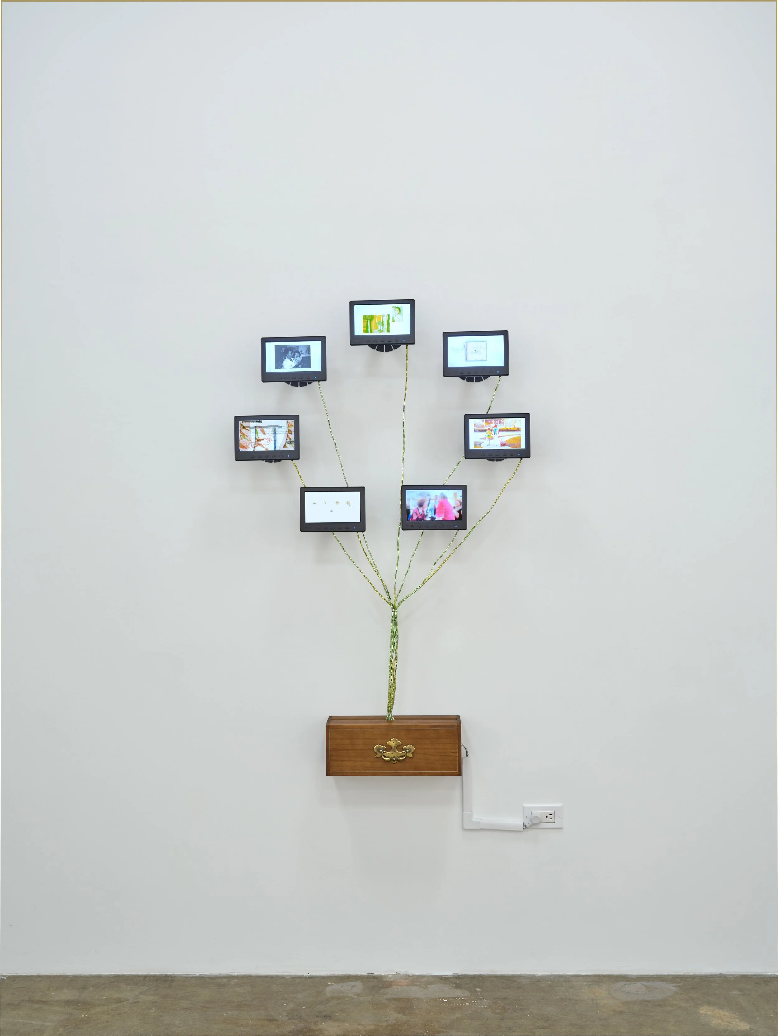 digital installation, single-channel video, 2 hr, LED monitors, plastic cord protectors, surge protector, wood drawer